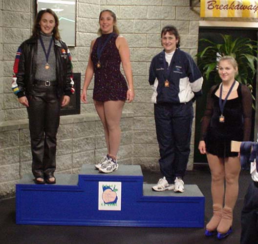 Jennifer started skating at the age of 7 when her grade school started a twice weekly skate day. She learned by watching and copying until age 12 when her parents started her in the local figure skating club's US Figure Skating Basic Skating Program. Through Jr. and Sr. High school she passed tests up to Juvenile Freestyle, Bronze Dances and 1st Figures. Her home club was not a competitive club so there were never any competitions, but there were huge show productions and Jennifer was awarded a solo in the show of her Senior year. Jennifer stopped skating until 1994 and since then has finished her Silver dances and passed her Adult Bronze and Silver Freestyle tests, as well as got married and had two daughters (ages 4 and 1 1/2). She has also enjoyed competing as an adult. She is currently working on her double salchow and passed her Gold Test on August 4, 2002! Jennifer was the focus of a newspaper article covering the 2001 Peach Classic. |